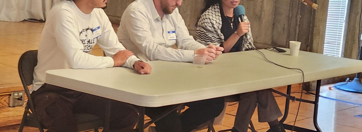 Our Human Rights Working Group members include students from encampments at the University of San Francisco—Ivan Villegas, UC Berkeley—Larissa Cursaro, and one of the attorneys working on their behalf, Jeff Wozniak. This event was a fundraiser on behalf of the students and included the film Where Olive Trees Weep. They articulately and knowledgeably explained their reasons for standing for Palestinian justice, and the audience embraced them. Watch the Video.